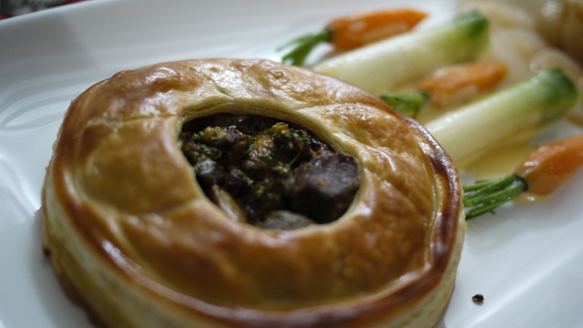 Enfourner la tourte 20 à 25 minutes après l'avoir dorer au jaune d'œuf une seconde fois. La retirer du four quand les bords sont bien montés, qu'elle est bien dorée et légèrement brunie. Juste avant la fin de la cuisson, réchauffer poireaux et carottes à la poêle SANS LES FAIRE DORER: cela briserait l'esthétique obtenue. Bien les enrober de matière grasse pour qu'ils soient brillants. Si vous voulez ajouter le sabayon, réaliser l'étape suivante; sinon ignorer-la. Note: le sabayon n'est pas stable, il faut le faire à la dernière minute. Dans la tourte, couper une tranche (si individuelle la placer directement dans l'assiette) sur un côté d'une assiette rectangulaire. de l'autre côté disposer les navets en demi-rosace, placer au centre les oignons grelots glacés. Entre la tourte et les navets, placets alternativement carotte et poireau. Si vous avez fait le sabayon, le répartir entre les poireaux et carottes. Servir avec le vin liquoreux.