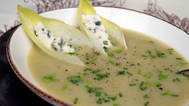 Servez dans des assiettes creuses avec les feuilles de chicon au roquefort et parsemez de ciboulette ciselée...