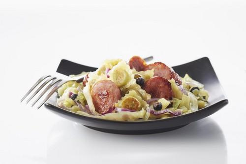 Dans chaque assiette, disposer un lit de chou et parsemer de ravioles à la saucisse de Montbéliard. Déguster immédiatement.