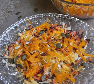 Le potimarron et les carottes anciennes forment un duo gagnant pour cette salade très gourmande, servie avec des graines et une sauce aux orties