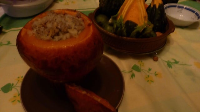 Remplissez le potiron de ce mélange. Reposez le « couvercle » et placez le potiron sur la plaque du four. - 5