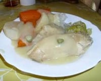 Sortir la poule de la cocotte, découpez-la en morceaux. Servez aussitôt accompagné de la sauce suprême et de riz blanc.