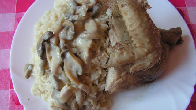Versez le riz dans le fond d'un plat creux chauffé, disposez la poule égouttée et coupée par-dessus et nappez-la de sauce. Servez aussitôt.