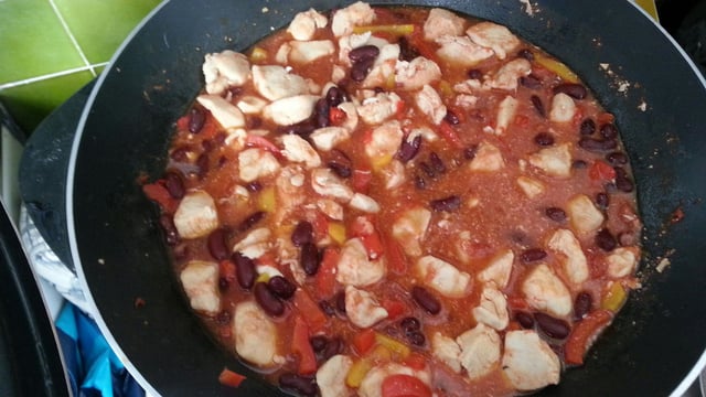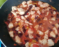 Découper les suprêmes de poulets en morceaux. Découper les poivrons en lamelles. Monder les tomates dans de l'eau bouillante. Les éplucher puis les couper également en lamelles. Égoutter les haricots ainsi que le maïs.