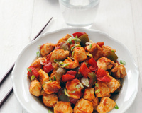 Verser le poulet dans la poêle contenant les légumes et ajouter le bol de sauce. Bien mélanger, couvrir et laisser cuire à feu doux pendant une dizaine de minutes en remuant régulièrement. Verser le contenu de la poêle dans un plat de service et terminer en parsemant par dessus le vert des oignons émincés.