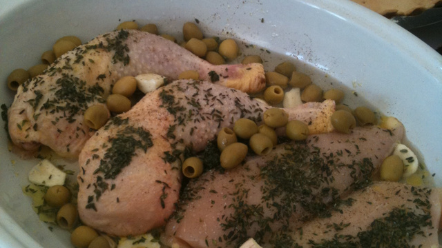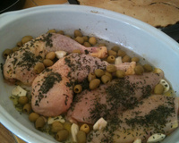 Dans un plat à four, déposer les cuisses de poulet, déposer les olives, les gousses d'ail et les pommes de terre tout autour, arroser d'huile d'olive, sel et poivre, verser un bon verre d'eau au fond du plat.