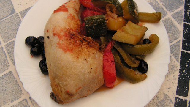Saisir les cuisses de poulet dans l''huile. Ajouter les poivrons coupés en lanières, les oignons émincés, les courgettes en cubes, les tomates en quartiers, les gousses d''ail épluchées, le vin rosé. Faire cuire 30 mn à feu doux.