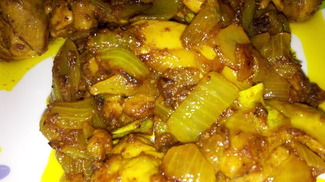 Ajoutez les morceaux de poulets et laissez cuire à feu moyen. Ajoutez du curry à votre convenance.