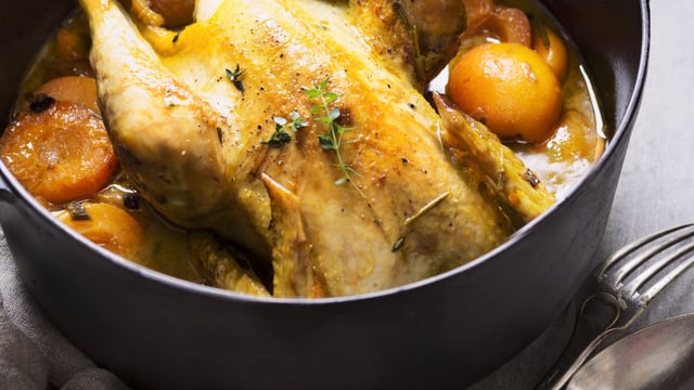 Déguster le poulet aux abricots et au cidre bien chaud accompagné de riz blanc et parsemer de coriandre fraîche ciselée juste avant de servir.
