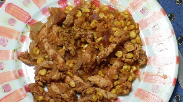 Egouttez et rincez le maïs et ajoutez-le dans la sauteuse. Remuez quelques minutes et ajoutez le poulet. Attendez encore 2/3 minutes et ajoutez la pulpe de tomates. Saler et poivrer légèrement.