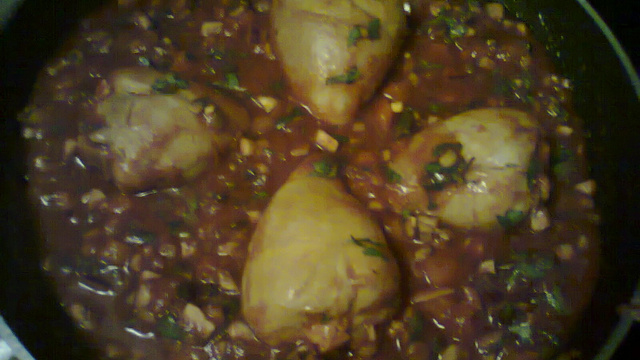 Ensuite ajouter de l'eau avec le poulet pour y faire une sauce avec les 3 cuillère de concentrer de tomate, y incorporer la coriandre, saler et poivrer.