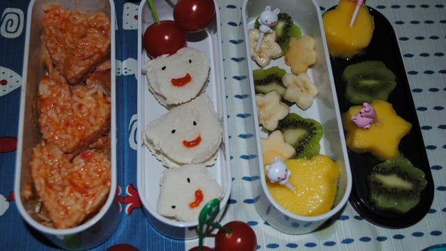 Faire cuire le riz et mettre du jus de la cocotte mettre dans votre bento du poulet en morceau et à l'aide d'emporte pièces en fore de petit coeur.