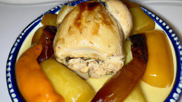 Mettre dans 2 cocottes, le poulet, recouvrir de dés de pommes, recommencer, en égalisant dans les 2 cocottes.