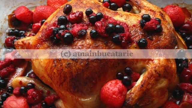 Pendant ce temps mettez un demi paquet de petits fruits dans un chinois, filtrez le jus de fruit et placez le sur le poulet, environ 20 minutes après avoir ajouté des pommes ou lorsque le poulet soit doré à votre goût.