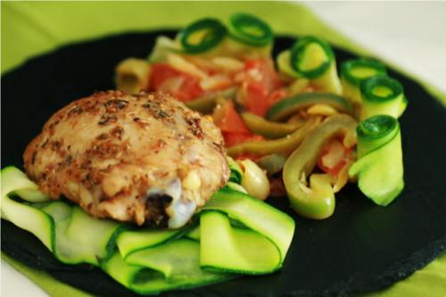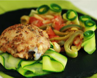 Disposez ensuite tous les ingrédients : tagliatelles, sauce de légumes et poulet dans votre assiette.