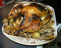 Disposer les marrons et les champignons autour du poulet (et au-dessous si le plat est un peu petit).