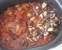 - Dénoyauter les olives, nettoyer et couper les champignons en lamelles. Faire blanchir les olives 3 min dans l'eau bouillante. Ajoutez olives et champignons au plat, 10 minutes avant la fin de la cuisson.
