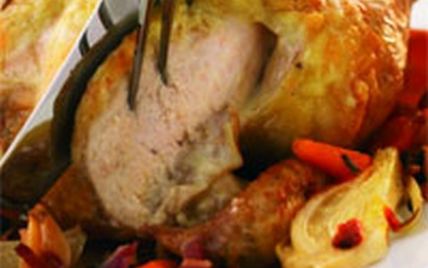 Faire rôtir pendant 55 à 60 minutes. Après 25 minutes de cuisson, ôter le bacon, qui doit être croquant, et le réserver. - 3