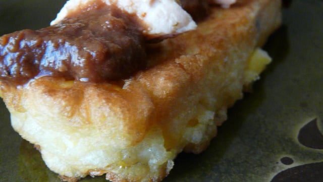 Prendre un saladier et verser la farine, le lait, le levure, l'oeuf, le sel et le poivre. Mélanger. Ajouter l'oeuf et mélanger à nouveau. Faire chauffer de l'huile d'olives dans une poële. Verser de la préparation dans un cercle ou rectangle à pâtisserie. Après 2 à 3 minutes, une fois la face colorée, retourner et cuire l'autre face. Servir avec le poulet et la sauce mole.