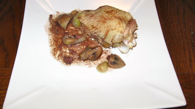Enlever les morceaux de poulet et la garniture de la cocotte, garder au chaud. Faire réduire sur feu vif le jus qui s'est formé dans la cocotte. Ajouter le vin rouge, laisser encore réduire. (10 min) Incorporer le beurre en fouettant. Délayer la maïzena dans 1 c à c d'eau froide. Ajouter à la sauce, bien remuer, laisser un peu épaissir. Napper les morceaux de poulet de cette sauce.