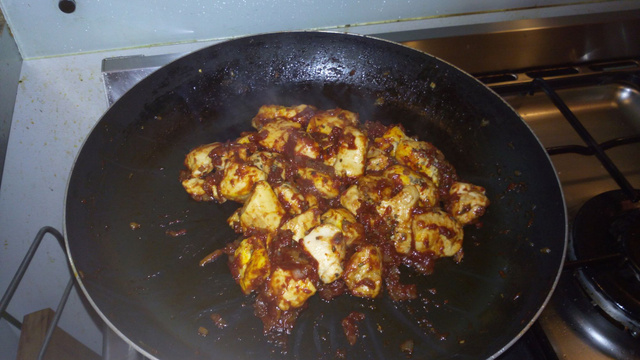 Couper les filets de poulet en cubes, et les faire cuire dans la poêle avec les oignons.