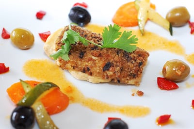 Déposer un pavé de poulet, la sauce réduite avec quelques olives et les légumes.