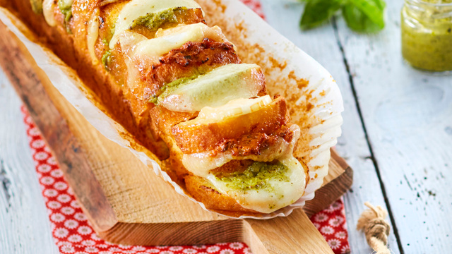 Alterner entre chaque tranche la combinaison de deux ingrédients : pesto verde/lamelles de mozzarella, pesto rosso/morceaux d’emmental, tranches de chèvre/miel.