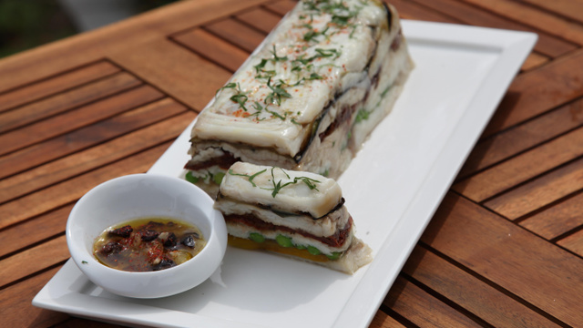 Montez le pressé dans une terrine filmée, en commençant par du poison, puis en alternant les couleurs de légumes (tomates, petits pois, poivron jaune et aubergine). Terminez le pressé par une couche de poisson. Tassez bien la terrine. Laissez prendre au froid le pressé pendant 6 heures minimum. Taillez les olives noires en petits dés, et pressez le citron.