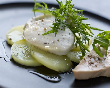 Monter en température le bouillon de cuisson des pommes de terre et à frémissement y plonger les tranches de foie gras, laisser cuire à feu doux.