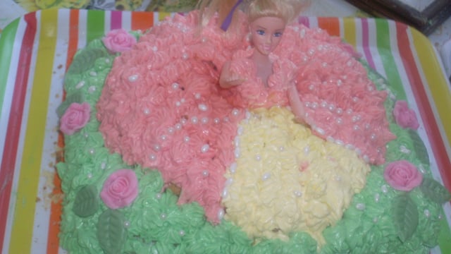 Cisailler un peu la robe génoise de façon a ce que la poupée puisse rentrée. Décorer de crème mousseline, évaser le milieu du jupon, donner lui de la couleur. décorer de perle et de roses en sucre