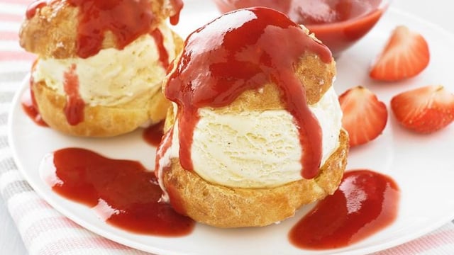 Disposez un trio de profiteroles sur une assiette plate ou ardoise.