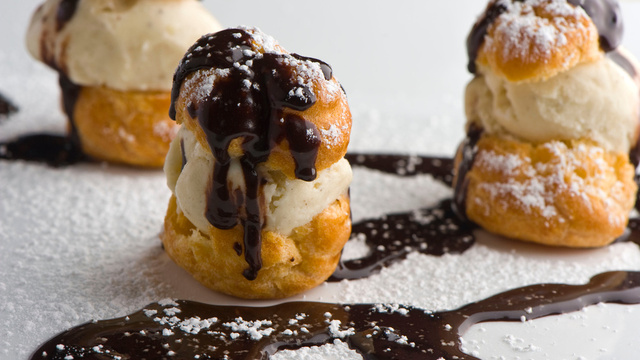 Couper le chapeau des choux, déposer une boule de glace, remettre le chapeau et servir avec la sauce au chocolat encore chaude.