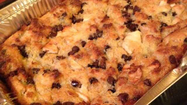 - 2Puis beurrer le plat. Mélanger le pain mouillé, le sucre, les oeufs, les pommes coupées en petits cubes et le chocolat en tous petits morceaux, mettre au four chaud ( 170°C) pendant 60 minutes.