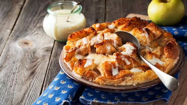 Le pudding est un classique de la gastronomie anglaise. Pour réussir cette variante aux pommes, vous allez avoir besoin de pain rassis. Après l'avoir coupé en petits morceaux, vous allez le mélanger avec du lait chaud, du sucre vanillé et deux œufs. C'est déjà le moment de passer au dressage. Dans un moule, vous allez verser la première moitié de votre appareil à pudding. Ensuite, vous allez éplucher puis couper deux pommes en quartiers. Après les avoir répartis à l'intérieur de votre moule, saupoudrez avec un peu de sucre en poudre puis verser la seconde moitié de l'appareil. À la dernière minute, rajoutez de la chapelure et du beurre fondu. Après une cuisson de 30 minutes au four, vous n'allez pas laisser une miette de votre pudding fruité !