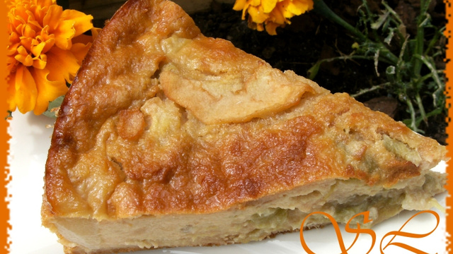 Un pudding en forme de tarte à la rhubarbe, juste adouci par une poire fondante et du sucre non raffiné.