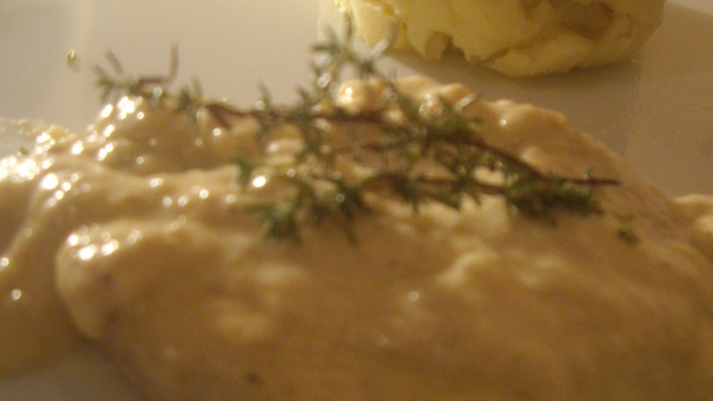 Une savoureuse purée au lait concentré non sucré et son escalope à la sauce de foie gras