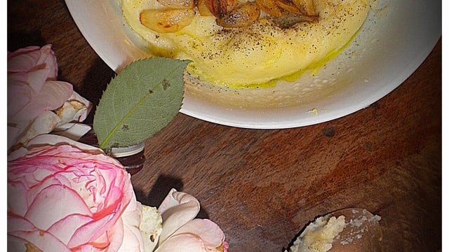 Verser huile + gousses sur la purée et servir de suite.