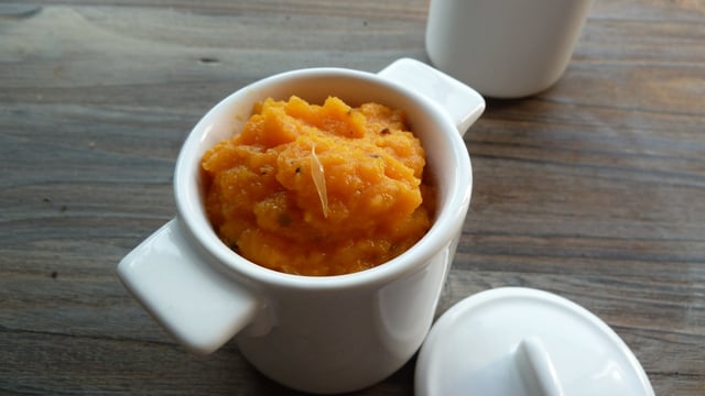 Une petite purée de courge toute simple avec de l'orange et une touche de sauge, qui sera parfaite avec une viande blanche.