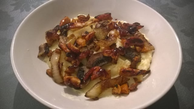 Purée de pommes de terre, champignons et oignons grillés et poulet caramélisé.