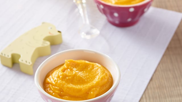 Passez au blender les carottes, pomme, morceaux de poulet et 1 cuillère à soupe d’huile ISIO 4 Touche d’Olive. Ajoutez un filet d'eau de cuisson si vous désirez que la purée soit moins consistante. Cette dernière doit être lisse et onctueuse.
