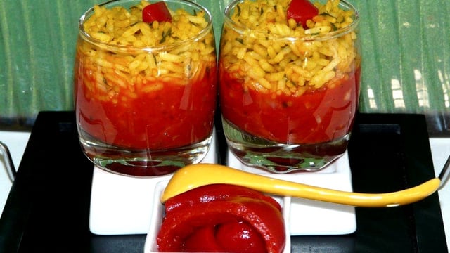 Laissez cuire encore, et remettez de l'eau si nécessaire. Ajoutez le piment en poudre. Surveillez la cuisson, goûtez le riz, s'il est tendre arrêtez le feu sinon poursuivez la cuisson quelques minutes. Quand le riz est cuit, remplissez vos verrines et servez !