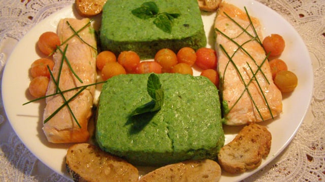 Éplucher les poivrons, les couper en morceaux et les mixer avec l'oignion et la crème fraîche .Rectifier l'assaisonnement et présenter le saumon entouré de sa purée de poivrons, agrémenté de pain grillé et de petites tomates cerises.