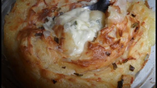 Faire cette purée avec un peu plus épaisse que d'habitude. Beurrer des cassettes ou autres (moi je l'ai mise dans un bol moyen), remplir le bol de purée puis creuser comme pour faire un puits et y mettre des morceaux de Fourme d'Ambert recouvrir avec la purée. Enfourner pour 15 min environ. Servir aussitôt.