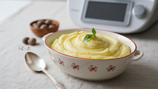 Cette purée est une solution pratique pour obtenir un accompagnement très onctueux sans sortir l'écrase-purée manuel. Le robot gère la cuisson des pommes de terre directement dans le lait, ce qui leur donne une texture très douce avant l'ajout final de beurre et de crème. C’est une recette qui demande peu de préparation et qui fonctionne à tous les coups avec un poulet rôti ou une viande grillée. Recette pour Thermomix TM31, TM5 ou TM6.