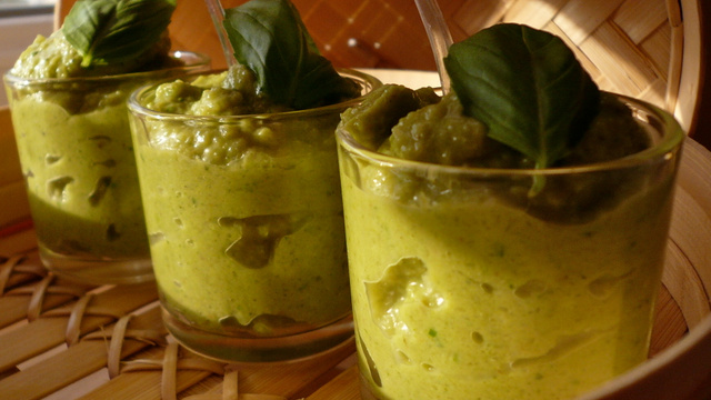 Répartir dans les verrines et décorer d'une feuille de basilic.