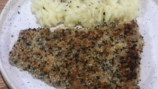 Pour le cabillaud : dans une assiette creuse, mettre la farine semi-complète avec une pincée le sel. Dans une seconde casser les œufs et les battre. Dans une troisième assiette mettre le reste des graines de chanvre. Tremper successivement les filets de cabillaud dans chacune des assiettes en faisant attention de retirer l’excédent de farine.