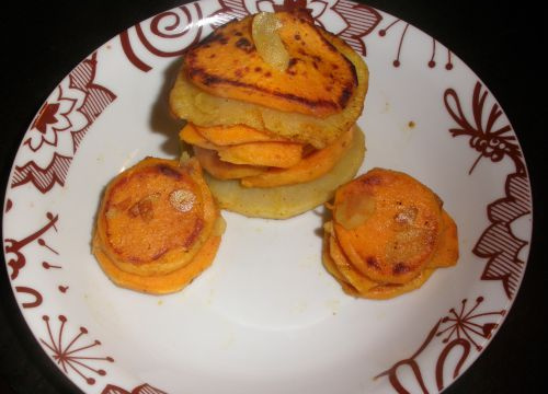 Cette recette se compose de patates douces, de navet et d'amande en tranches, disposés en pyramide.