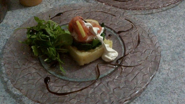 C'est une recette facile à réaliser qui est esthétique du fait du double cerclage (carré pour l'écrasé de pommes de terre et rond pour les pousses d'épinards) avec une tranche de saumon fumé au sommet de la pyramide.Servi avec une salade de pousses d'épinards.