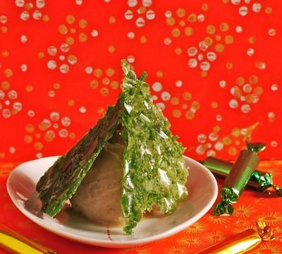 Enfourner 2 minutes à 230°C en surveillant : dès que des bulles apparaissent à la surface, retirer la plaque du four et laisser tiédir. Découper avec une couteau éminceur, d'un geste sec, une douzaine de tuiles triangulaires. Dans chaque assiette, dresser une boule de glace marrons glacés et déposer trois tuiles en forme de pyramide.