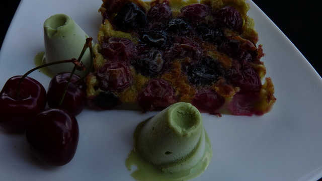 Clafoutis cerise-pistache et crème glacée maison à la pistache
